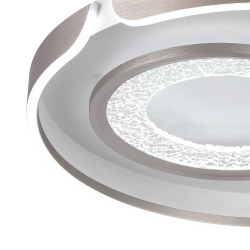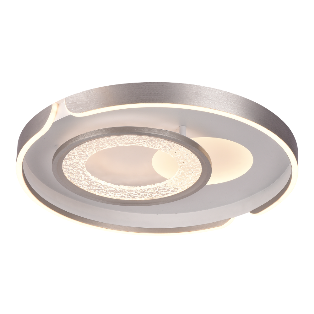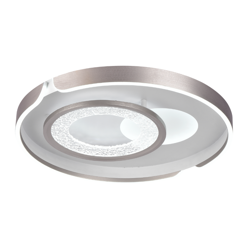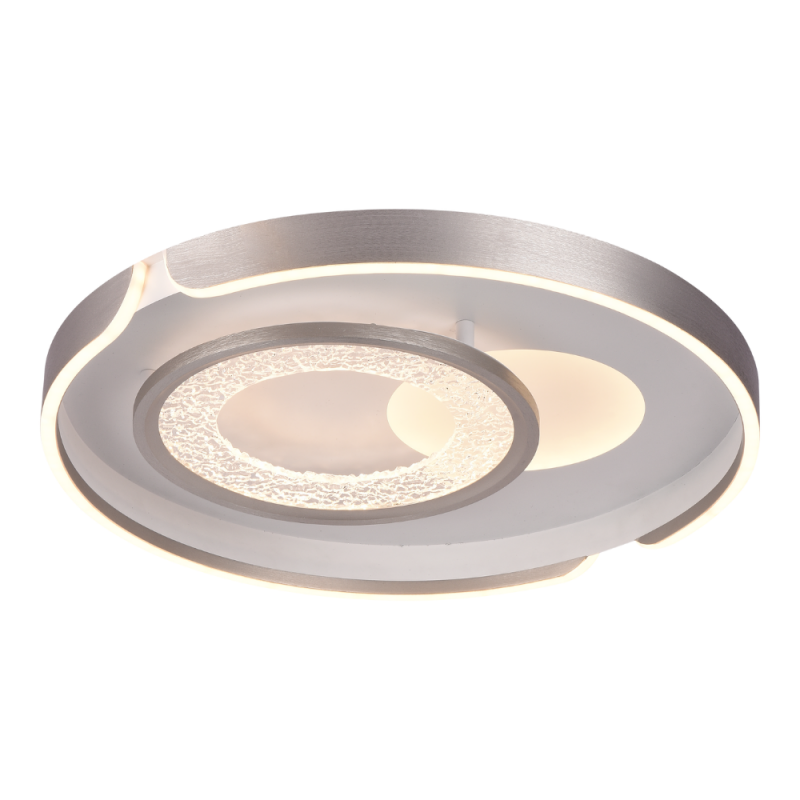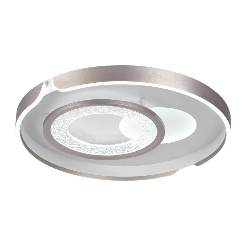 El plafón de techo Musgravita Redondo LED 78w es la combinación perfecta entre diseño contemporáneo y funcionalidad avanzada. Su estructura en forma redonda, con acabado en blanco y plata, se realza con detalles en acrílico texturizado tipo cristal, que aportan un efecto decorativo elegante tanto encendido como apagado. Fabricado con materiales de alta calidad como metal, aluminio, acrílico y silicona, garantiza durabilidad, eficiencia y una estética moderna. Gracias a su sistema de iluminación 3CCT, este plafón permite ajustar la tonalidad de la luz (3000K, 4500K y 6000K), adaptándose a diferentes ambientes y necesidades, desde una luz cálida y acogedora hasta una luz blanca intensa para tareas que requieren concentración. Incluye un mando a distancia con funciones avanzadas: regulación de intensidad, cambio de temperatura de color, temporizador y función de luz de posición o noche. Su diseño ultraplano de solo 7 cm de alto y un diámetro generoso lo convierten en la opción ideal para salones, dormitorios, pasillos o despachos, aportando un toque decorativo sin ocupar espacio visual. Con una potencia de 78W y una emisión luminosa de aproximadamente 6000 lúmenes, proporciona una iluminación potente y homogénea para espacios medianos y grandes, optimizando el consumo energético gracias a la tecnología LED de alta eficiencia. Disponible en formato cuadrado.