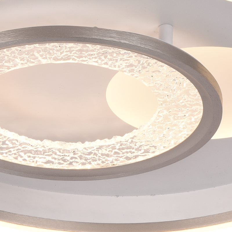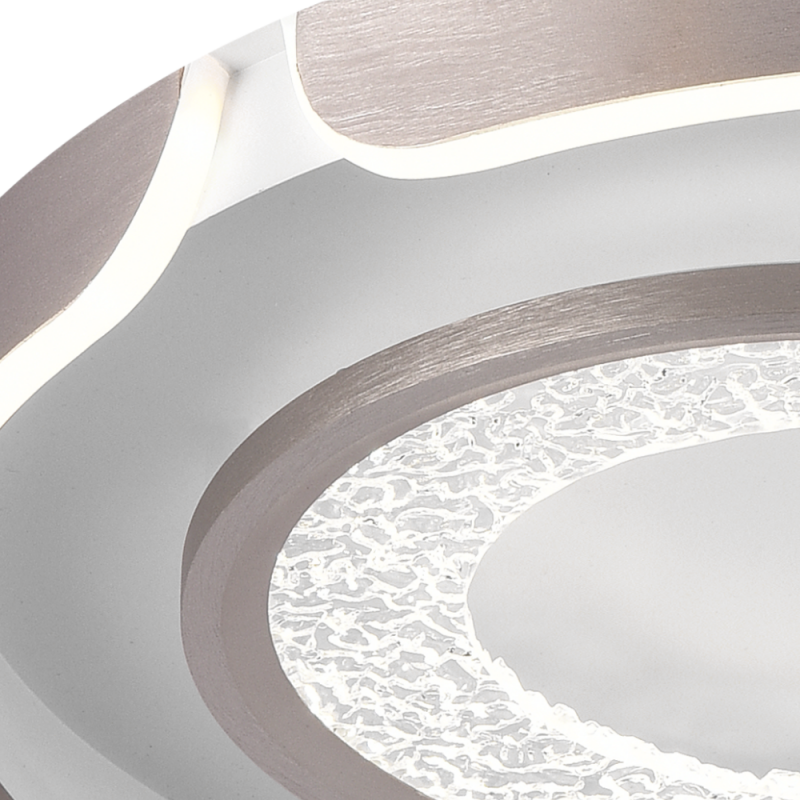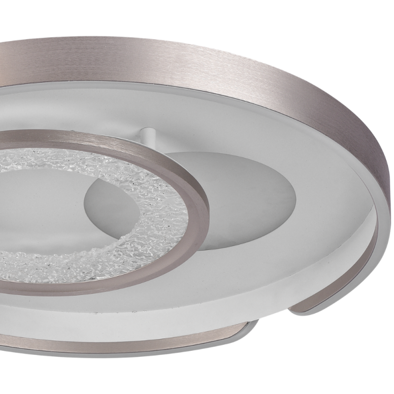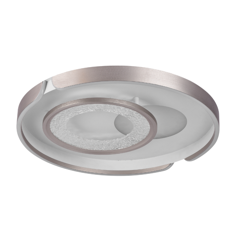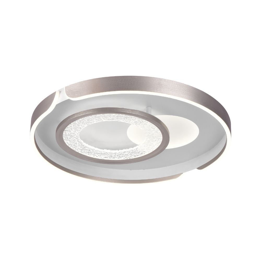 El plafón de techo Musgravita Redondo LED 78w es la combinación perfecta entre diseño contemporáneo y funcionalidad avanzada. Su estructura en forma redonda, con acabado en blanco y plata, se realza con detalles en acrílico texturizado tipo cristal, que aportan un efecto decorativo elegante tanto encendido como apagado. Fabricado con materiales de alta calidad como metal, aluminio, acrílico y silicona, garantiza durabilidad, eficiencia y una estética moderna. Gracias a su sistema de iluminación 3CCT, este plafón permite ajustar la tonalidad de la luz (3000K, 4500K y 6000K), adaptándose a diferentes ambientes y necesidades, desde una luz cálida y acogedora hasta una luz blanca intensa para tareas que requieren concentración. Incluye un mando a distancia con funciones avanzadas: regulación de intensidad, cambio de temperatura de color, temporizador y función de luz de posición o noche. Su diseño ultraplano de solo 7 cm de alto y un diámetro generoso lo convierten en la opción ideal para salones, dormitorios, pasillos o despachos, aportando un toque decorativo sin ocupar espacio visual. Con una potencia de 78W y una emisión luminosa de aproximadamente 6000 lúmenes, proporciona una iluminación potente y homogénea para espacios medianos y grandes, optimizando el consumo energético gracias a la tecnología LED de alta eficiencia. Disponible en formato cuadrado.