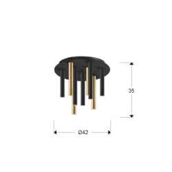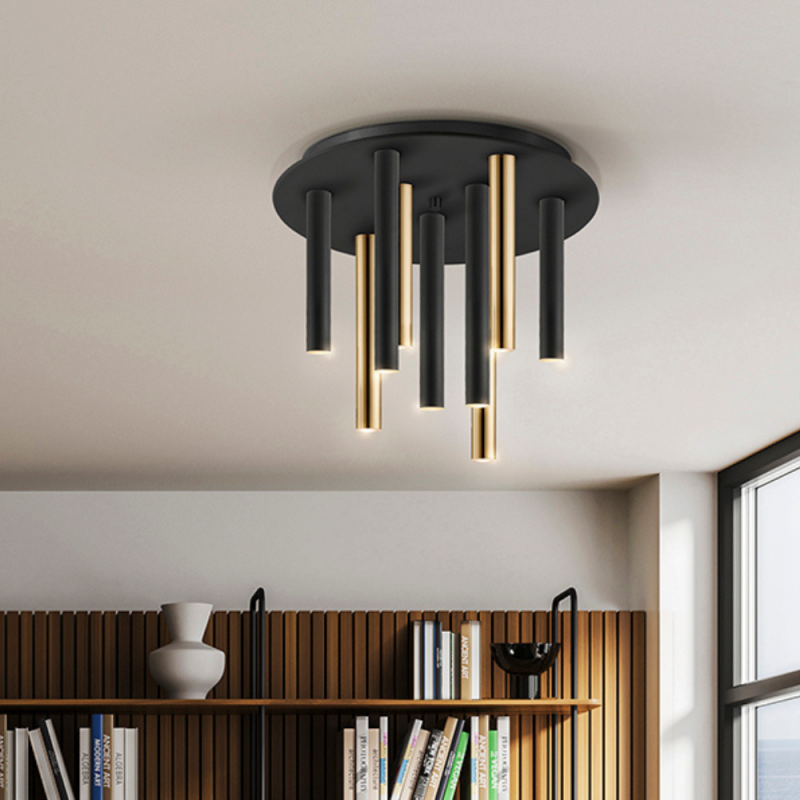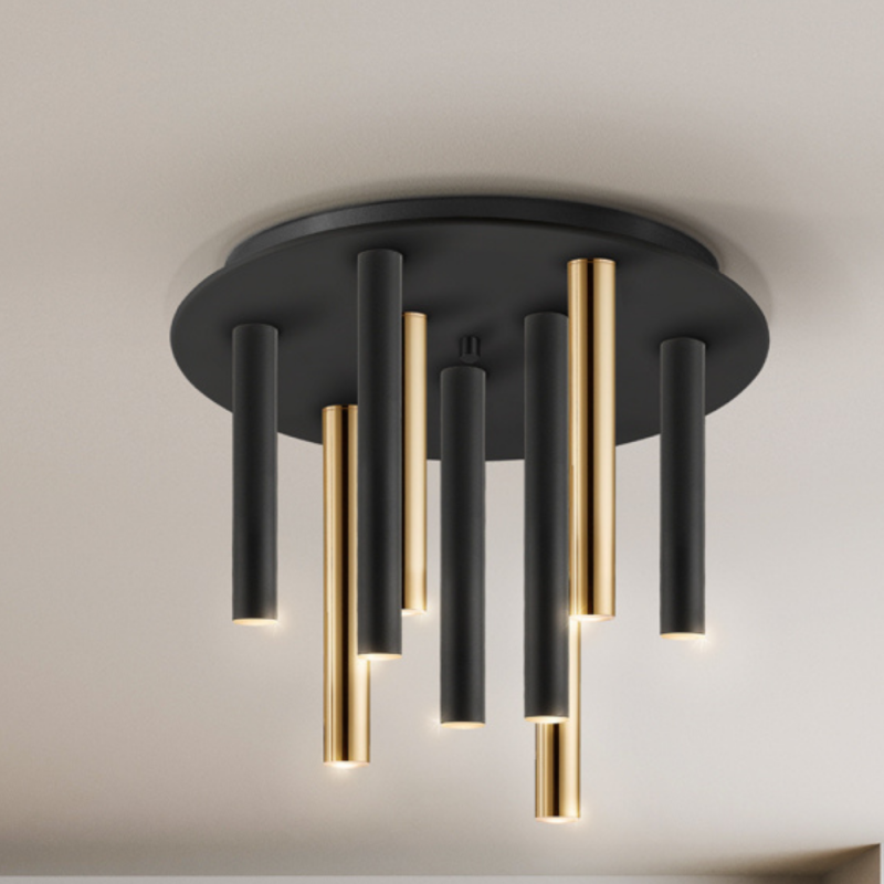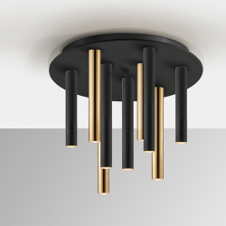 Plafón VARAS 9L LED 45W 3000K en oro y negro Ø42 cm. Diseño moderno y elegante para techos bajos.