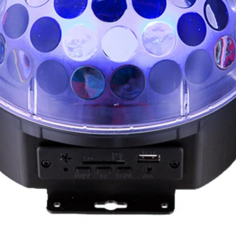SOBREMESA DISCO. Lámpara sobremesa en forma de bola realizada en polietileno de medio punto, esmaltado claro y base de polietileno negra. Dispone de entrada de audio y control del volumen además del cambio de color rojo/verde/azul pudiendo elegir las diferentes funciones con el mando a distancia. Mando a distancia y LED incluidos.