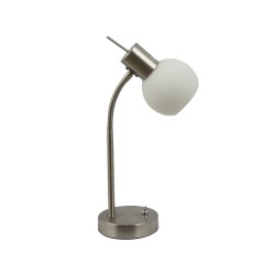 La lámpara de sobremesa Krabi Níquel tiene un diseño moderno con base de metal en níquel mate y pantalla de cristal blanco mate. Es compatible con bombillas LED, tiene un interruptor integrado y un cabezal flexible para dirigir la luz. También está disponible en cuero dorado envejecido.