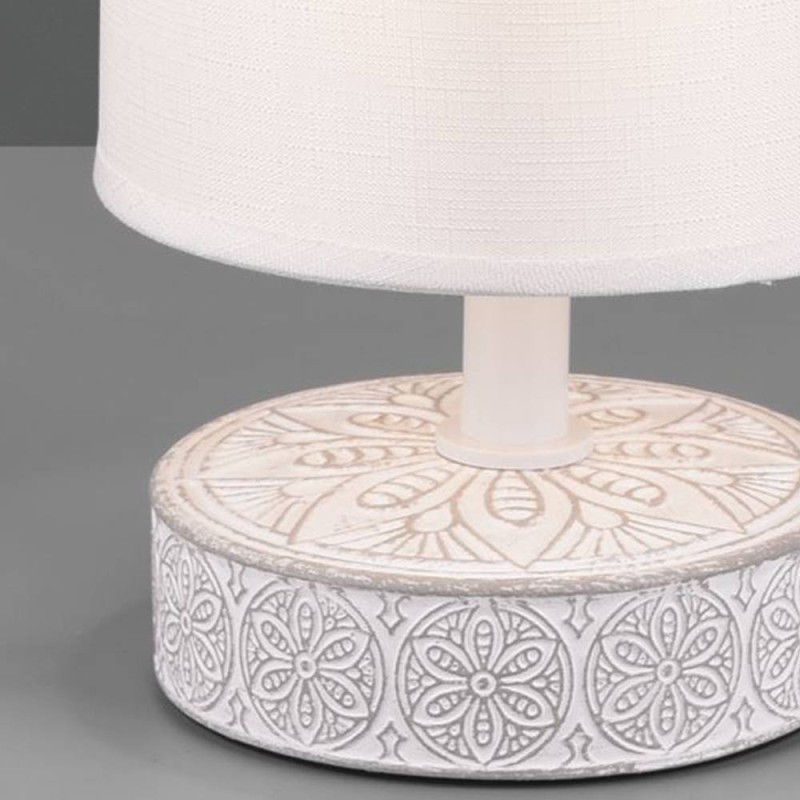 Pequeña sobremesa de la serie Marie. Su base es de cerámica con unos grabados muy originales. Su pantalla de tela es tono blanco. Marie es compatible con bombillas led (no incluida).Gracias a su diseño este tipo de sobremesa es ideal para utilizar en estancias de dormitorio. Disponible en acabado gris y en acabado marrón.