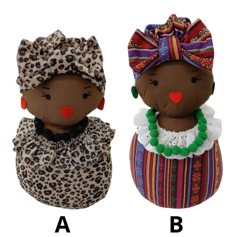 Añade color y carácter a tu entrada con este sujeta-puertas en forma de muñeca africana. Confeccionada en tela estampada con detalles de bisutería y turbante, es suave por fuera y lastrada con arena por dentro para que mantenga la puerta abierta sin rayar el suelo.Medidas: base Ø 20 cm · 30 cm de alto. (precio unidad).