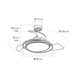 Ventilador de aspas retractiles modelo Antila. Su estructura es de acero en acabado negro. Sus aspas son de ABS transparente. Difusor de acrílico blanco. Su motor es DC, poco consumo y silencioso. Lleva integrada una placa led de 60w consumo. Sus aros emiten una luz indirecta y muy agradable. Incluye mando a distancia y desde él, podremos elegir la tonalidad de la luz (cálida, neutra, fría), regular la intensidad de ella, temporizador, memoria de encendido, función invierno-verano. Tiene 6 velocidades: Potencia del motor (W) 9.5 / 14 / 17 / 25 / 28 / 30 . RPM 160 / 175 / 190 / 206 / 218 / 228.Flujo de aire m³/hr 6120 / 6840 / 7200 / 7920 / 8640 / 9720.Decibeles de sonido (DB) 24 / 28 / 30 / 32 / 34 / 36 Incluye también dos tijas (10cm y 20cm) para poder adaptarlo a la altura que necesitemos. Antila es ideal para instalar en estancias de 15-20m².Apto para techo inclinado Max. 14º .Medida de ventilador con aspas plegadas 58cm Ø. Disponible en otros acabados.