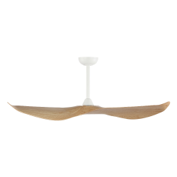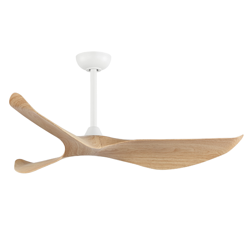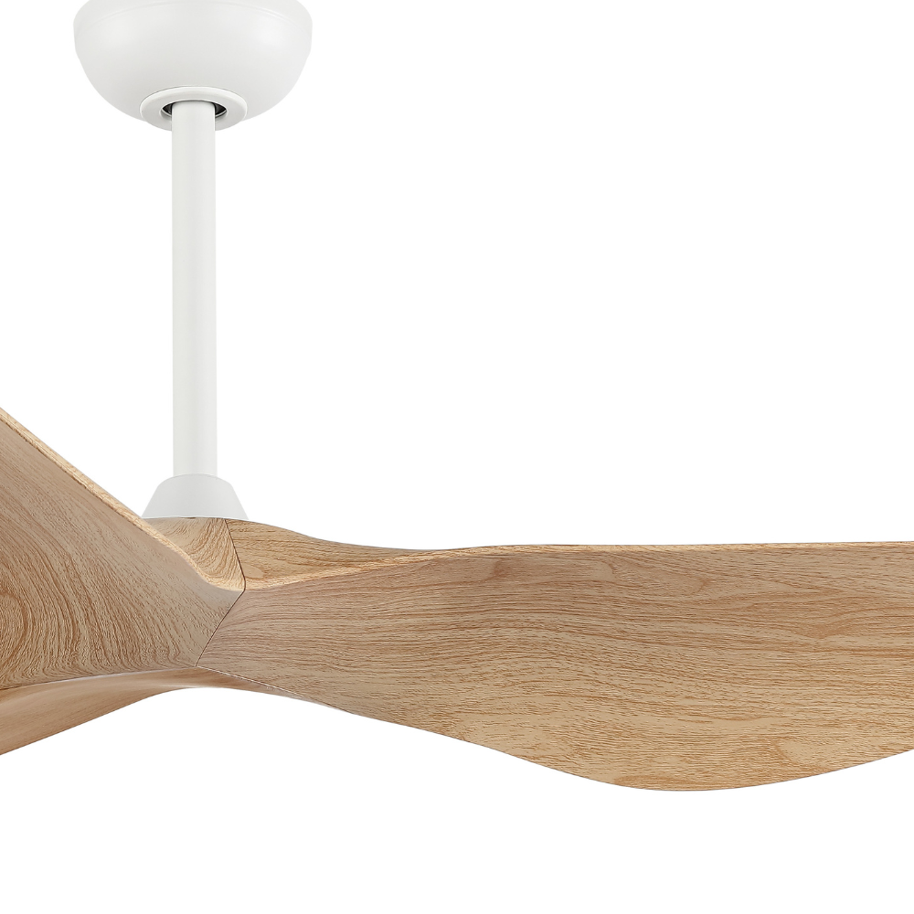Compra el ventilador de techo Cali con motor DC, diseño imitación madera natural y cuerpo blanco. 6 velocidades, modo verano/invierno, control remoto, sin luz, ideal para interiores modernos. Ø127 cm.