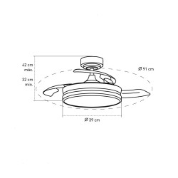 Ventilador de aspas retractiles modelo Ice. Su estructura es de acero cuero , sus aspas son de ABS transparente y su difusor está realizado en PMMA blanco. Lleva integrado led de 35w consumo (3900lm).Incluye mando a distancia y desde él podremos elegir la tonalidad de la luz (3000k/4000k/6000k), regular la intensidad de la luz.Su motor es DC. Tiene 6 velocidades: RPM 164 / 187 / 208 / 226 / 246 / 260 Flujo de aire m³/hr 2340 / 2250 / 3060 / 3600 / 4770 / 5580 Potencia del motor (W) 5 / 7,2 / 9,4 / 12,3 / 15,7 / 20Decibeles de sonido (DB) 28 / 29 / 32 / 33 / 36 / 39 . El ventilador Ice es ideal para utilizar en estancias de 10- 13m². Incluye función invierno verano y dos barras de 10cm y de 20cm para poder modificar la altura a la hora de la instalación. Posibilidad de instalar en techos con una inclinación de max.18º. Su medida con la aspas plegadas es de 39cm Ø. Disponible en acabado blanco, níquel y en un tamaño superior.