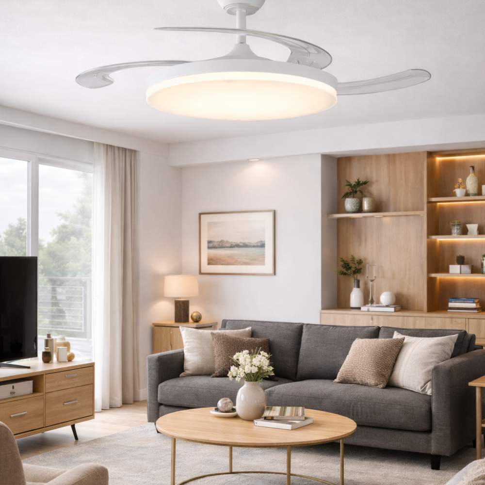 Diseñado para ofrecer confort, eficiencia y estilo, el ventilador de techo Luna es la solución ideal para dormitorios y salones modernos. Con aspas retráctiles que se ocultan cuando no están en uso, su diseño limpio y minimalista se integra discretamente en cualquier ambiente.