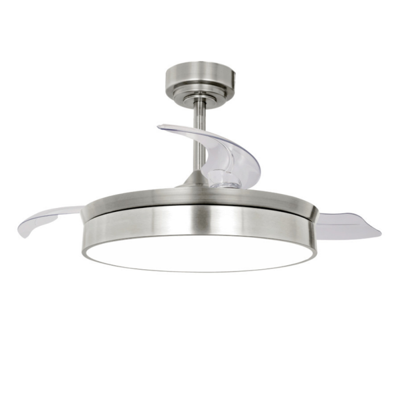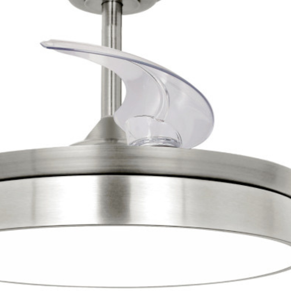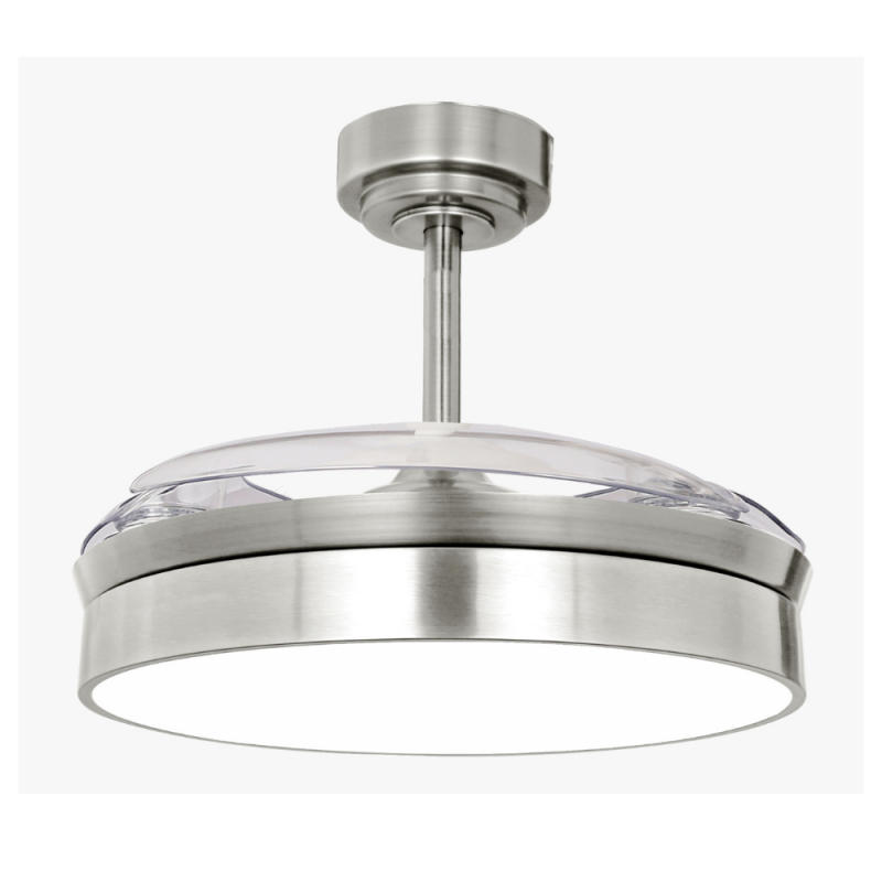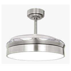 Ventilador Tornado Mini níquel LED 46w 3CCT. Su estructura es de acero acabado níquel y sus 3 aspas retráctiles son PC transparente. Su motor es DC, silencioso y de bajo consumo. Lleva led integrado, mando a distancia, 6 velocidades entre otras funciones.